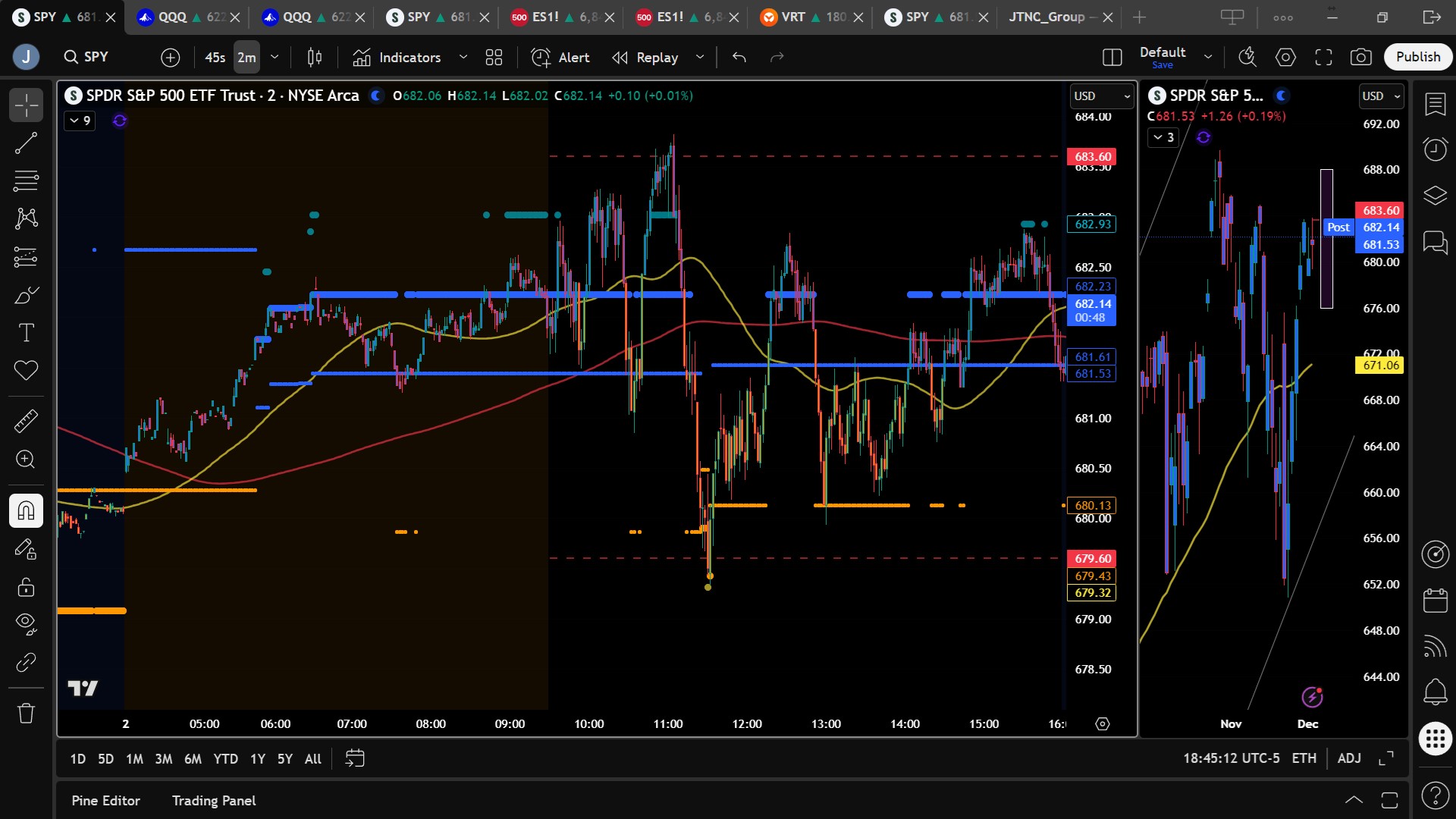 On Monday we stated, “the battle continues to favor the bulls,” and added, “For Tuesday we will look for bounces toward $675 and also seek shorts up to $685 for two-day, rangebound trading,” while also noting, “look to buy dips more cautiously, fade rallies below $685 on failed breakouts.” With this context, and with the MSI opening in a narrow bullish state, we waited for a clean long off MSI support. That setup appeared at 9:52 am, and we entered long at $681.50 with T1 set just above MSI resistance at $682.50 to ensure at least a $1 profit. We set T2 at the premarket level of $683.60, which hit before noon. With two targets secured, we moved our stop to breakeven and trailed to see whether $685 might come into play. It did not, and SPY formed a textbook failed breakout, but because extended targets still printed above, we passed on the short and took final profits at $683 before waiting for the next opportunity. Price then dropped quickly, and although we wanted to short, the move was too fast to catch safely. Once SPY reached $679.50 and printed a failed breakdown with extended targets no longer printing, we entered long again at $679.95 with T1 at the premarket level of $681.10. T1 hit by noon, and we set T2 at MSI resistance at $681.55 while trailing the remainder. After another pop and another failed breakout just after noon, we decided the market had given us enough for the day and exited the second long at $682.25, closing out a solid session with two clean trades. Two for two and done by 1 pm thanks to having a clear plan, maintaining patience and discipline, and staying aligned with MSI signals, market structure, and our broader trading framework. The MSI continues to prove its reliability as the cornerstone of our trading process.