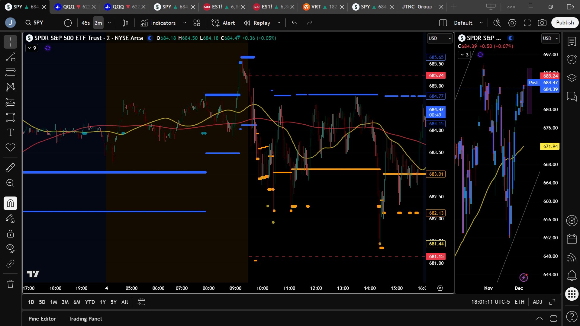 On Wednesday we stated “For tomorrow these cues suggest higher prices, yet there is a wall at $685 that the bulls must clear to push toward new all time highs,” and added “we continue to favor the bulls while still watching for shorts on failed breakouts near $685,” while also noting “For Thursday we will look for bounces toward $680 and also seek shorts up to $685 for another rangebound session.” With this context, and with the MSI trading in the premarket above $685 but without extended targets above, we wanted to fade the pop and the textbook failed breakout, so we entered short at $685.25 with T1 at MSI support at $684.12. T1 hit quickly and with the MSI rescaling lower, we set T2 at MSI support at $682.90, which also hit, leaving us to trail the remaining 10% with a stop at breakeven. The MSI kept rescaling lower and a flash down to $682.25 produced a clean failed breakdown, so we exited the remainder for a solid first trade. We considered going long, but a few brief extended targets kept us sidelined, and as quickly as SPY fell it rallied back toward $685. The MSI shifted into a ranging state, which we do not trade, and it stayed that way almost the entire session. Not wanting to force trades in messy conditions, we chose to call it a day before 11 am and waited for better setups. One and done and a nice one it was thanks again to having a clear plan, maintaining patience and discipline, and staying aligned with MSI signals, market structure, and our broader trading framework. The MSI continues to prove its reliability as the cornerstone of our trading process.